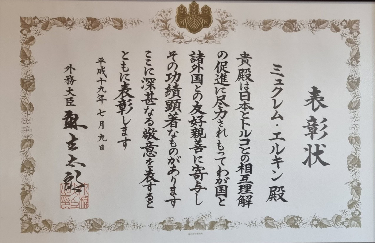 1)  9 TEMMUZ 2007 YILINDA JAPONYA DIŞİŞLERİ BAKANI SAYIN TARO ASO TARAFINDAN MÜKREMİN ERKİN BEY’E VERİLEN TAKDİRNAME: